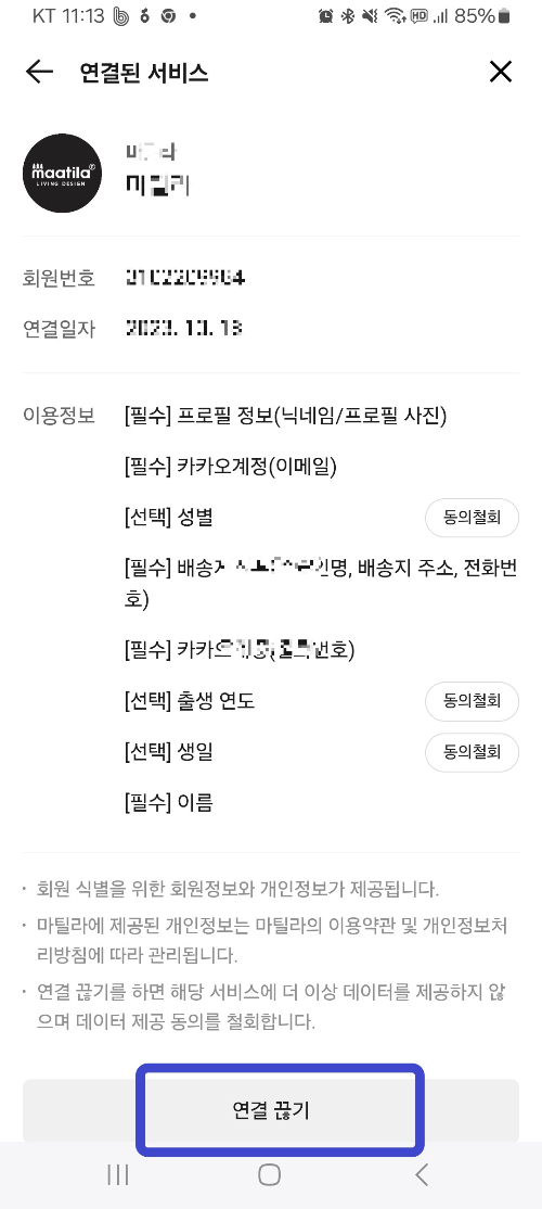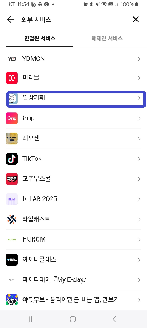 연결된 서비스중에서 원하지 않는 사이트를 연결 끊기 누르면 됩니다.