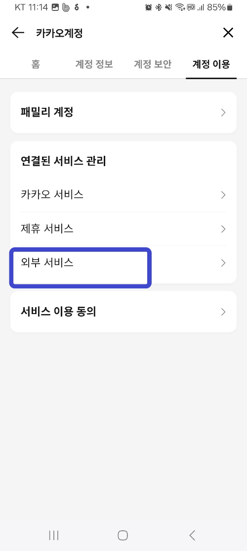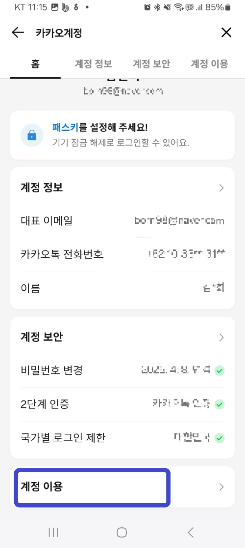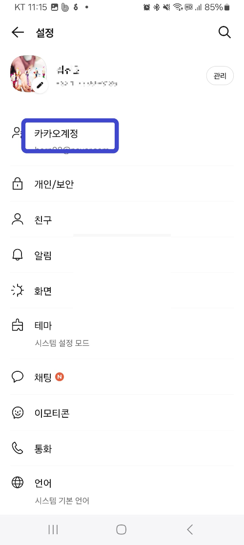 '카카오 계정 메뉴로 들어 가서