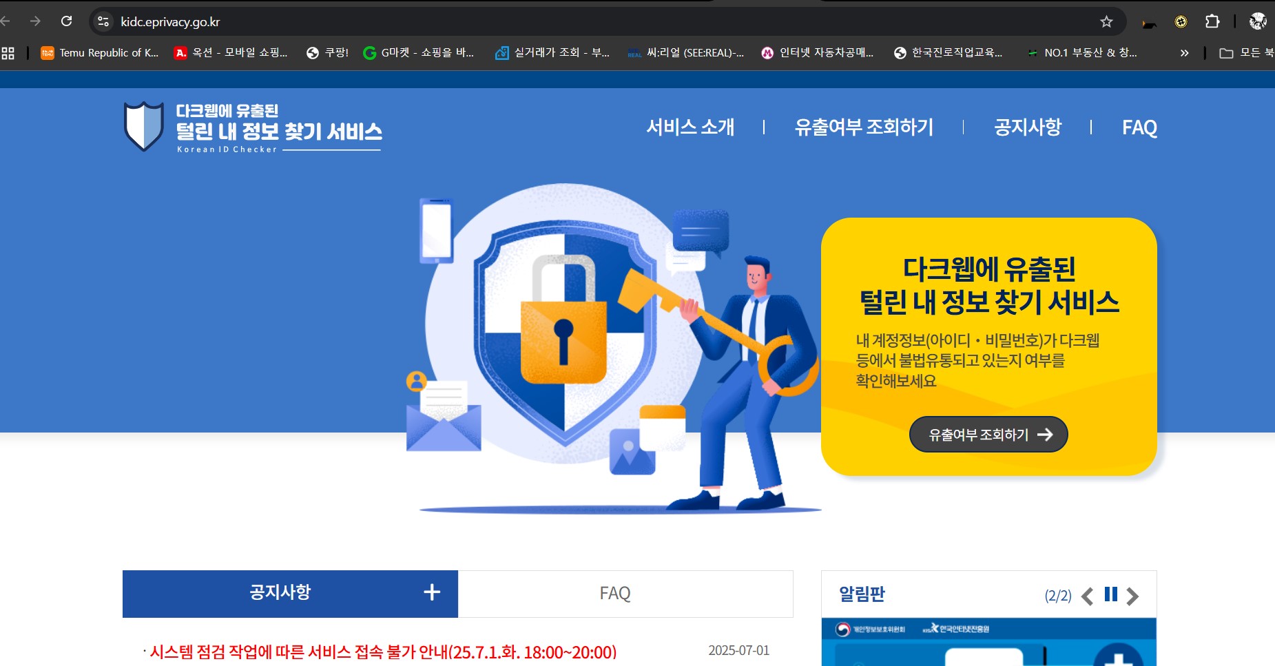 다크웹에 유출된 내 정보를 다행이도 정부에서 찾아 주고 있습니다. 유출여부 조회하기 버튼을 눌러 확인하면 됩니다.